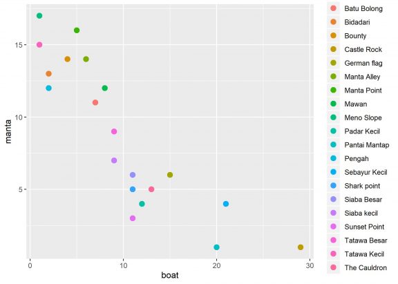 Our exercise today is to map our manta safari data. First we set our working directory, and then add the data so R can convert it to plot. The plots produced by R look very clear and professional, like the picture below. We can see the information about number of boats, mantas, and the dive site. It’s cool, right ?
